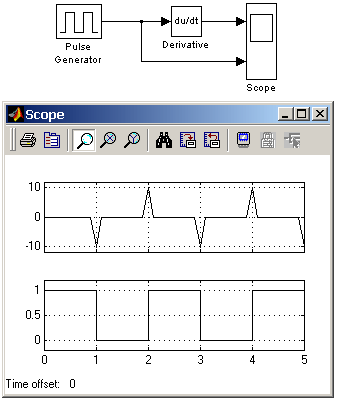 Данный блок используется для дифференцирования аналоговых сигналов. При дифференцировании дискретного сигнала с помощью блока Derivative его выходной сигнал будет представлять собой последовательность импульсов соответствующих моментам времени скачкообразного изменения дискретного сигнала.