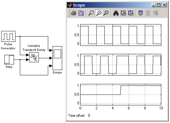 Рис. 9.3.8. Пример использования блока Variable Transport Delay.