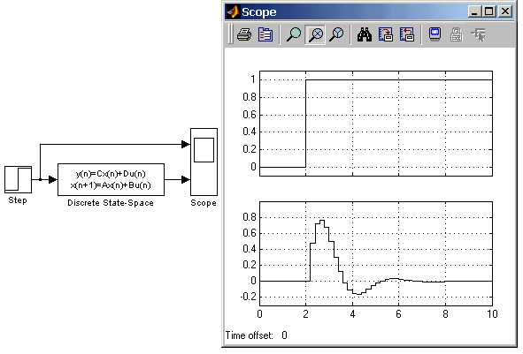 На рис. 9.4.10 показан пример моделирования динамического объекта с помощью блока Discrete State-Space. Матрицы блока имеют следующие значения: