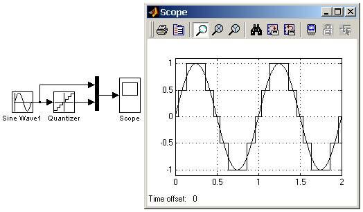 На рис. 9.5.5 показан пример использования блока Quantizer, выполняющего квантование по уровню синусоидального сигнала. Шаг квантования задан равным 0.5.