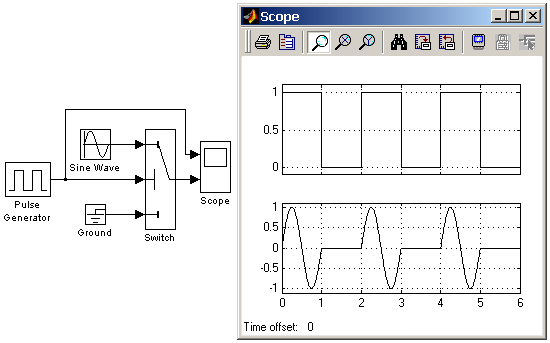 На рис. 9.5.8 показан пример работы блока Switch. В том случае, когда сигнал на управляющем входе ключа равен 1, на выход блока проходит гармонический сигнал, если же управляющий сигнал равен нулю, то на выход проходит сигнал нулевого уровня от блока Ground. Пороговое значение управляющего сигнала задано равным 0.5.