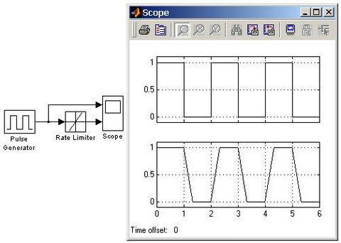 На рис. 9.5.4 показан пример использования блока Rate Limiter, при подаче на его вход прямоугольного периодического сигнала.