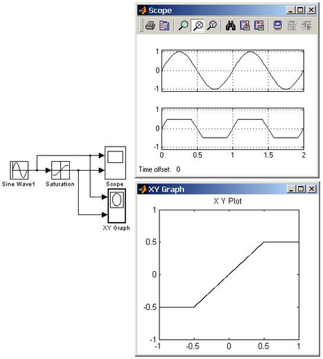 Выходной сигнал блока равен входному если его величина не выходит за порог ограничения. По достижении входным сигналом уровня ограничения выходной сигнал блока перестает изменяться и остается равным порогу. На рис. 9.5.1 показан пример использования блока для ограничения синусоидального сигнала. На рисунке приводятся временные диаграммы сигналов и зависимость выходного сигнала блока от входного.