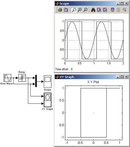 На рис. 9.5.3 показан пример использования блока Relay. На временных диаграммах видно, что включение реле происходит при достижении входным сигналом величины 0.5, а выключение при - 0.5.