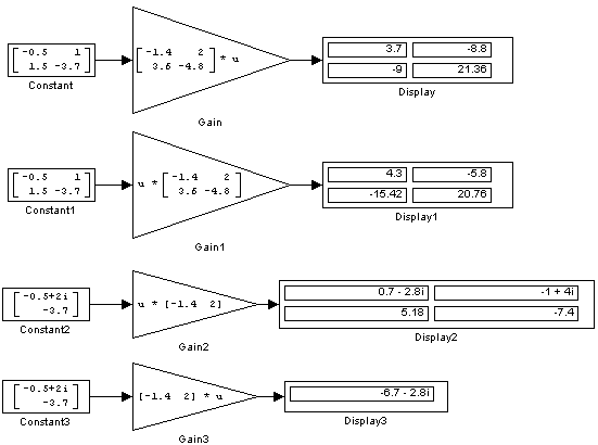 Примеры использования блока Matrix Gain при выполнении матричных операций показаны на рис. 9.6.8.