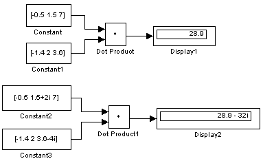 Входные сигналы блока могут быть скалярными, векторными или матричными действительного и комплексного типа. При векторном или матричном входном сигнале блок выполняет поэлементные операции.