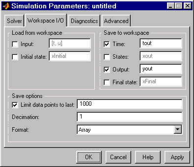 Load from workspace (Загрузить из рабочей области). Если флажок Input (Входные данные) установлен, то в расположенном справа текстовом поле можно ввести формат данных, которые будут считываться из рабочей области MATLAB. Установка флажка Initial State (Начальное состояние) позволяет ввести в связанном с ним текстовом поле имя переменной, содержащей параметры начального состояния модели. Данные, указанные в полях Input и Initial State, передаются в исполняемую модель посредством одного или более блоков In (из раздела библиотеки Sources).