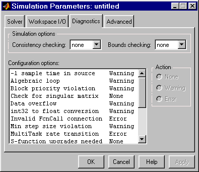 Сообщения об ошибках или проблемных ситуациях, обнаруженных Simulink в ходе моделирования и требующих вмешательства разработчика выводятся в командном окне MATLAB. Исходный перечень таких ситуаций и вид реакции на них приведен в списке на вкладке Diagnostics. Разработчик может указать вид реакции на каждое из них, используя группу переключателей в поле Action (они становятся доступны, если в списке выбрано одно из событий):