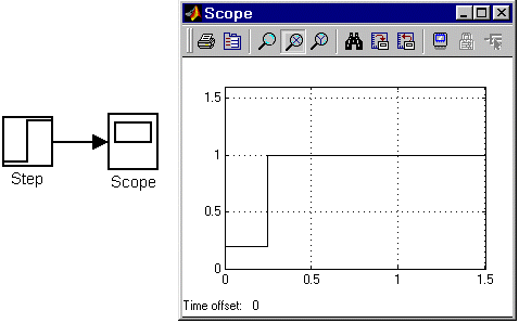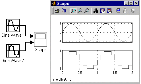На Рис. 9.1.2 показано применение блока с разными значениями шага модельного времени (Sample time = 0 для блока Sine Wave 1и Sample time = 0.1 для блока Sine Wave 2). Для отображения графиков выходных сигналов в модели использован виртуальный осциллограф (Scope).