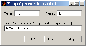 3. Щелкнуть правой клавишей “мыши” в окне графиков и, выбрать команду Axes properties… в контекстном меню. Откроется окно свойств графика, в котором с помощью параметров Y-min и Y-max можно указать предельные значения вертикальной оси. В этом же окне можно указать заголовок графика (Title), заменив выражение %<SignalLabel> в строке ввода. Окно свойств показано на рис. 9.2.4.