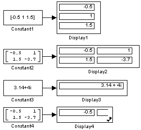 Рис. 9.2.15 Применение блока Display для отображения векторных, матричных и комплексных сигналов.