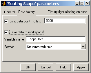 Data history – параметры сохранения сигналов в рабочей области MATLAB.