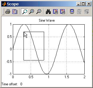 Для того, чтобы открыть окно просмотра сигналов необходимо выполнить двойной щелчок левой клавишей “мыши” на изображении блока. Это можно сделать на любом этапе расчета (как до начала расчета, так и после него, а также во время расчета). В том случае, если на вход блока поступает векторный сигнал, то кривая для каждого элемента вектора строится отдельным цветом.