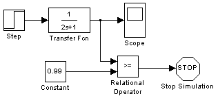 При подаче на вход блока ненулевого сигнала Simulink выполняет текущий шаг расчета, а затем останавливает моделирование. Если на вход блока подан векторный сигнал, то для остановки расчета достаточно, чтобы один элемент вектора стал ненулевым. На рис. 2.9.16 показан пример использования данного блока. В примере остановка расчета происходит, если выходной сигнал блока Transfer Function становится большим или равным 0.99.