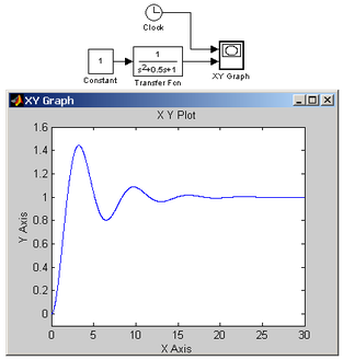 Графопостроитель можно использовать и для построения временных зависимостей. Для этого на первый вход следует подать временной сигнал с выхода блока Clock. Пример такого использования графопостроителя показан на рис. 9.2.13.