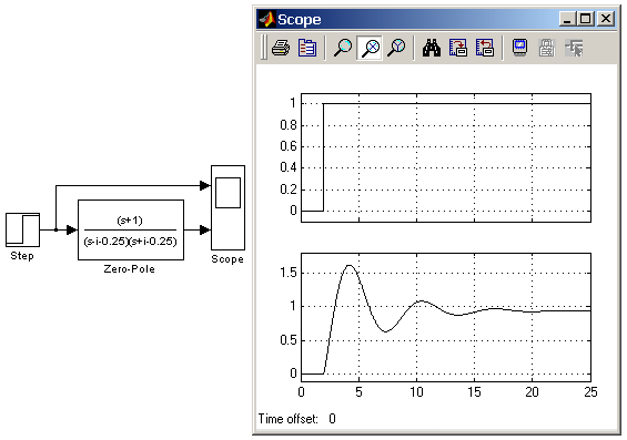 На рис. 9.3.10 показан пример использования блока Zero-Pole. В примере передаточная функция имеет один действительный нуль и два комплексно-сопряженных полюса.
