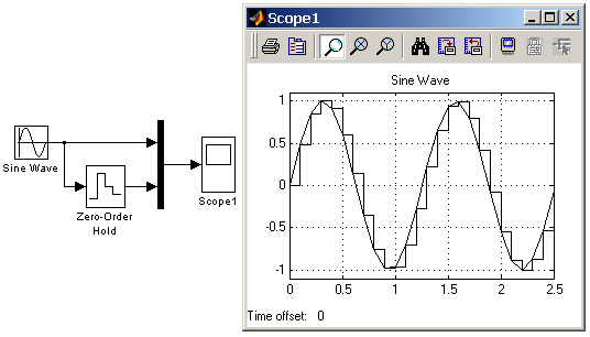 На рис. 9.4.2 показан пример использования блока Zero-Order Hold для формирования дискретного сигнала.