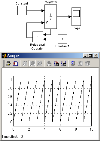Пример на рис. 9.3.4 демонстрирует использование входного порта для сброса выходного сигнала и порта состояния интегратора с целью организации обратной связи. Схема работает следующим образом: входной постоянный сигнал преобразуется интегратором в линейно-изменяющийся, по достижении выходным сигналом значения равного 1 блок Relational Operator вырабатывает логический сигнал, по переднему фронту которого происходит сброс выходного сигнала интегратора до начального значения равного нулю. В результате на выходе интегратора формируется пилообразный сигнал, изменяющийся от 0 до +1.