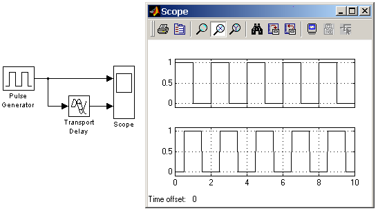 Рис. 9.3.7. Пример использования блока Transport Delay для задержки сигнала.