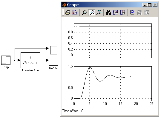 Входной сигнал блока должен быть скалярным. В том случае, если коэффициенты числителя заданы вектором, то выходной сигнал блока будет также скалярным (как и входной сигнал). На рис. 9.3.8 показан пример моделирования колебательного звена с помощью блока Transfer Fcn.