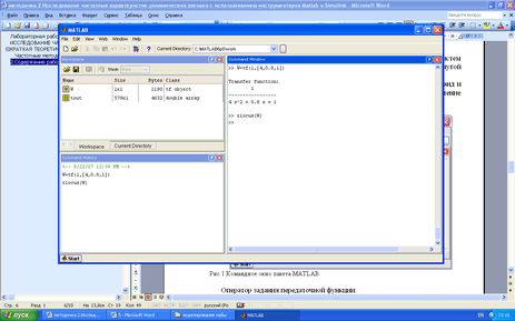 Все действия в данной работе выполняются посредством ввода команд и операторов в командном окне пакета MATLAB (рис.2.2). Получение характеристик и их анализ производится в среде Control System Toolbox.