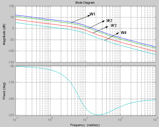 Рисунок 2.4 Пример ЛЧХ системы: Δφ(W4) – запас устойчивости по фазе для W4; ΔА(W1) – запас устойчивости по амплитуде для W1.