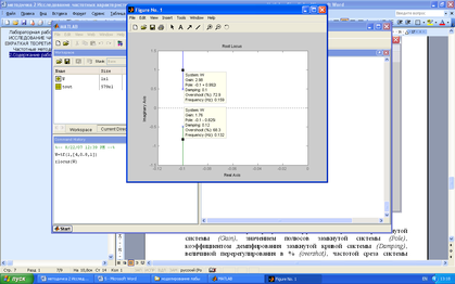 Каждая точка характеризуется коэффициентом усиления разомкнутой системы (Gain), значением полюсов замкнутой системы (Pole), коэффициентом демпфирования замкнутой кривой системы (Damping), величиной перерегулирования в % (overshot), частотой среза системы (Frequency).