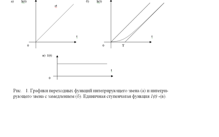 Рисунок 1.1. Графики переходных функций интегрирующего звена (а), интегрирующего звена с замедлением (б). единичная ступенчатая функция 1(t) – (в)