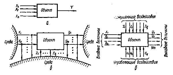 а — модель как обобщенный преобразователь; б — связи объекта (модели) со средой; в — схема объекта с внешними воздействиями