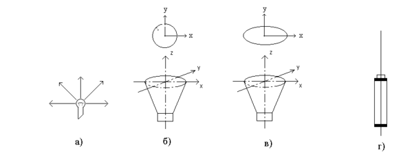 Рис.1. Пространственное распределение излучения лампы (а), светодиода (б), полупроводникового лазера (в), твердотельного или газового лазера (г)
