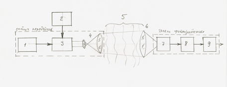 | 1. Источник излучения – генерирует оптическую несущую. 2. Источник аналогового или цифрового электрического сигнала – сообщение, которое необходимо передать. 3. Оптический модулятор. 4. Передающая антенна – осуществляет формирование оптического луча и ввод его в канал передачи. | 5. Канал передачи оптического излучения – может представлять собой одну физическую среду (например, свободное пространство, атмосферу, воду) или комбинацию нескольких сред. 6. Приемная антенна. 7. Фотодетектор. 8. Усилитель. 9. Устройство обработки сигнала (демодулятор). |