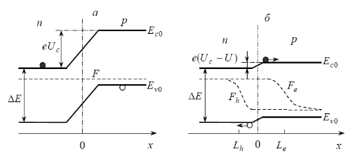 Рис. 5. Схема энергетических зон в p-n переходе в отсутствии поля (а) и с полем, приложенном в проводящем направлении (б).