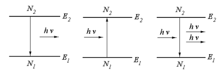 Рассмотрим замкнутую систему, состоящую из атомов одного сорта. В энергетическом спектре атомов выделим два уровня с энергиями E1 и E2. Между выделенными уровнями возможны оптические переходы трех типов: спонтанные переходы с излучением, переходы с поглощением света, вынужденные переходы с излучением. Частота испускаемого (поглощаемого) при этом кванта равна