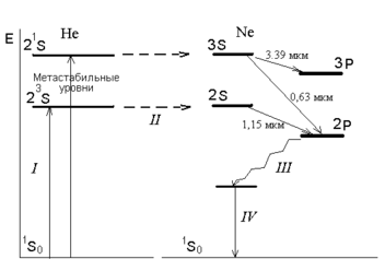 II – заселение уровней Ne при неупругом столкновении с возбужденными атомами He; III – избирательная релаксация; IV – обеднение уровней Ne при их соударениях со стенками разрядной трубки.
