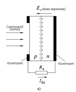 Фотогальванический эффект возникает в полупроводниках с внутренним потенциальным барьером (например с p-n переходом или с переходом металл-полупроводник). Внутреннее электрическое поле перехода разделяет возникшие под воздействием оптического излучения фотоносители. Пространственно разделенные фотоносители разных знаков (дырки и электроны) создают фотоЭДС.