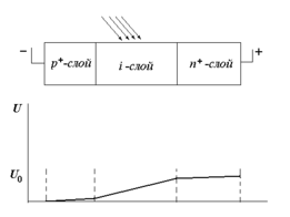 i – слой с собственной проводимостью, обладающий большим сопротивлением; р+ и n + – сильно легированные слои р и n – типа.