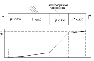 Эффект лавинного умножения заключается в следующем: фотоносители, генерируемые под действием света в области обратносмещенного р-n- перехода, при обратном напряжении, близком к пробивном, приобретают дополнительную энергию, достаточную для ионизации узлов кристаллической решетки с образованием новых электронно-дырочных пар.