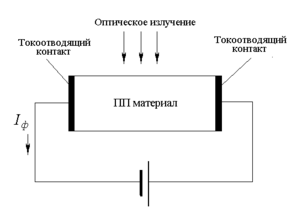 Эффект фотопроводимости используется в фоторезисторах. Под воздействием падающего на п/п материал оптического излучения (в результате поглощения полупроводником фотонов) в нем образуются дополнительные дырки и электроны (фотоносители), что приводит к уменьшению сопротивления фоторезистора.