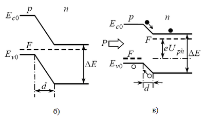 Рис. 17. Упрощенная структура фотодиода (а) и схема энергетических зон в p-n переходе в отсутствие падающего излучения (б) и при облучении светом (в)