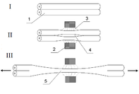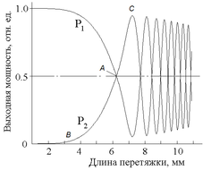 | 4. Разветвители на основе сплавления и биконической перетяжки волокон (сплавные разветвители). Матрица 1х2 Y-типа; 2х2 X-типа; 1хN; NxN. Одномодовые и многомодовые. Потери менее 0,1 дБ для ОМ. Рис. 8 Величина мощности в выходных каналах разветвителя может быть записана в виде: где L – длина перетяжки; С – коэффициент связи, определяющий степень взаимодействия между собственными модами волновода (коэф. связи зависит от длины волны С(λ)) | Рис. 9. Метод изготовления сплавных ОР 1 – оптические волокна; 2 – нагревательный элемент; 3 – зона нагрева; 4 – участок сплавления волокон; 5 – биконическое сужение Рис. 10. Зависимость мощности оптического излучения в выходных каналах ответвителя от длины зоны перетяжки. |