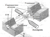 | Рис. 3. Принцип сварки электрической дугой. | Собственно процедура сварки реализуется в три этапа: 1) Очистка волокна (расстояние между торцами примерно 100 мкм; подается кратковременная электрическая дуга, которая выжигает загрязнения. 2) Оплавление, или предсварка (расстояние между торцами примерно 10–15 мкм; ток дуги и ее продолжительность увеличиваются). Торцы приобретают выпуклую форму. 3) Основная сварка (ток дуги и время ее подачи возрастают еще больше и регулируются по определенному алгоритму. При расплавлении стекла волокна сводятся вплотную, сплавляются и формируется их соединение По принципу выравнивания волокон перед сваркой аппараты делятся на ручные, полуавтоматические и автоматические. Типичные значения потерь соединения 0,05…0,1 дБ. Обратное отражение –60…–70 дБ |