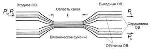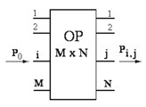 | Оптический разветвитель представляет собой пассивный оптический многополюсник, имеющий M входных и N выходных оптических полюсов, в котором оптическое излучение, подаваемое на какой-либо входной оптический полюс, распределяется в заданном соотношении между выходными его полюсами. Наиболее часто применяются разветвители 1×2 (Y-типа); 2×2 (X-типа); звездообразные разветвители 1×N и N×N (N = 8, 16, 32). | Рис. 4. Представление волоконно-оптического разветвителя как пассивного оптического многополюсника. |