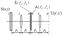 В передней фокальной плоскости линзы помещен транспарант 1 с записью какой-либо функции S(x,y). Транспарант освещается когерентным излучением. Линза 2 выполняет прямое преобразование Фурье. В ее задней фокальной плоскости 3 формируется пространственный спектр