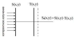 Действие транспаранта характеризуется комплексной функцией пропускания T(x,y). При этом распределение амплитуды светового поля после транспаранта будет иметь вид (рис.2.1):