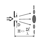 Представление поля в дальней зоне через интеграл ФурьеВ когерентной оптике преобразование Фурье описывает дифракцию Фраунгофера при прохождении когерентного пучка через оптическую систему с достаточно малой угловой апертурой. Действительно, любая дифракционная оптическая система с помощью когерентных волн кроме изображения объекта, определяемого законами геометрической оптики ставит ему в соответствие двумерный фурье-образ на плоскости, определяемый законами дифракции. Дифракция Фраунгофера наблюдается, если выполняется условие дальней зоны: H>>D2/λ. |