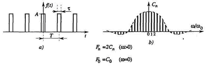 Рис. 2.1. Периодическая последовательность прямоугольных импульсов (а), ее спектр
