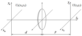 Если на вход такой системы (рис. 4.1) поступает оптический сигнал U0(x0,y0), то на выходе появляется сигнал U(xf,yf), связанный с входным сигналом следующим соотношением (при d = F):