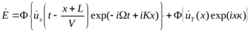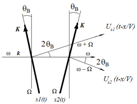 Полное поле в выходной плоскости АОМ состоит из трех волн: невозмущенной плоской (первое слагаемое) и двух квазиплоских волн, промодулированных пространственно-временным образом комплексным сигналом (второе слагаемое) и комплексно-сопряженным сигналом (третье слагаемое). Две последние волны имеют частотный сдвиг ±Ω0.