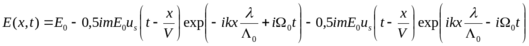 где m – индекс модуляции, E0 – комплексная амплитуда падающей волны, λ – длина волны оптического излучения, Ω0 – несущая частота электрического сигнала, Λ0 – длина волны акустической волны на несущей частоте,