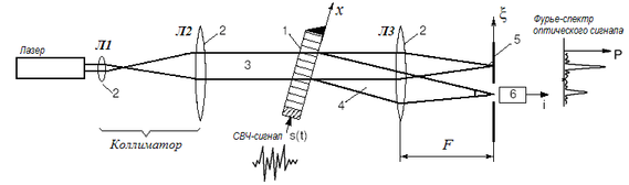 Радиочастотный СВЧ-сигнал возбуждает в звукопроводе АОМ акустические колебания, пространственный спектр которых определяется спектром СВЧ-сигнала и передаточной характеристикой электроакустического преобразователя. При освещении АОМ когерентным светом в фокальной плоскости линзы формируется фурье-спектр оптического сигнала, дифрагирующего на АОМ. Каждой фурье-гармонике этого спектра соответствует определенная фурье-компонента спектра анализируемого СВЧ-сигнала. Распределение мощности света в фокальной плоскости линзы, отображающее спектр СВЧ-сигнала, регистрируется, например, с помощью фотоприемника, перед которым располагается сканирующая щель или с помощью линейки фотодиодов.
